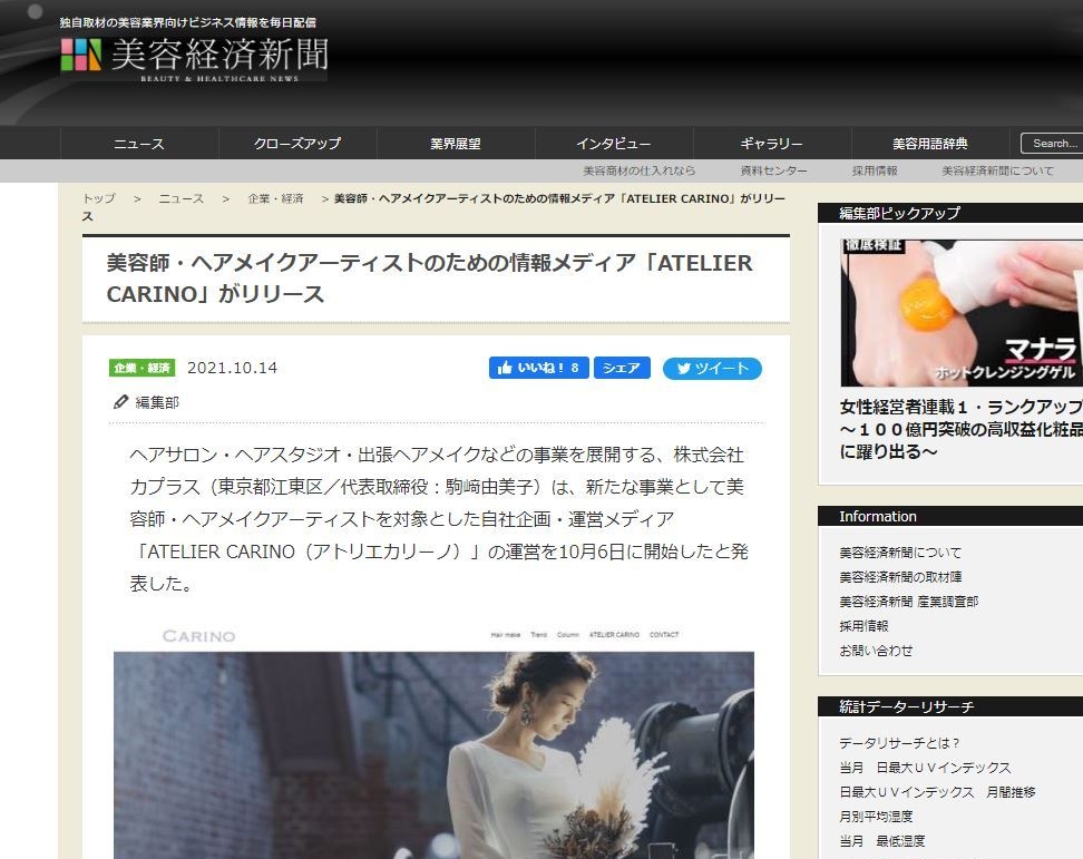 2021年10月6日(水)にリリース致しました、美容師・ヘアメイクアーティストを対象とした自社企画・運営メディア「ATELIER CARINO(アトリエカリーノ)」が、美容経済新聞に掲載されました。